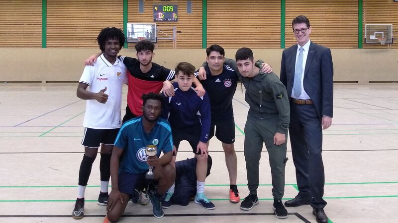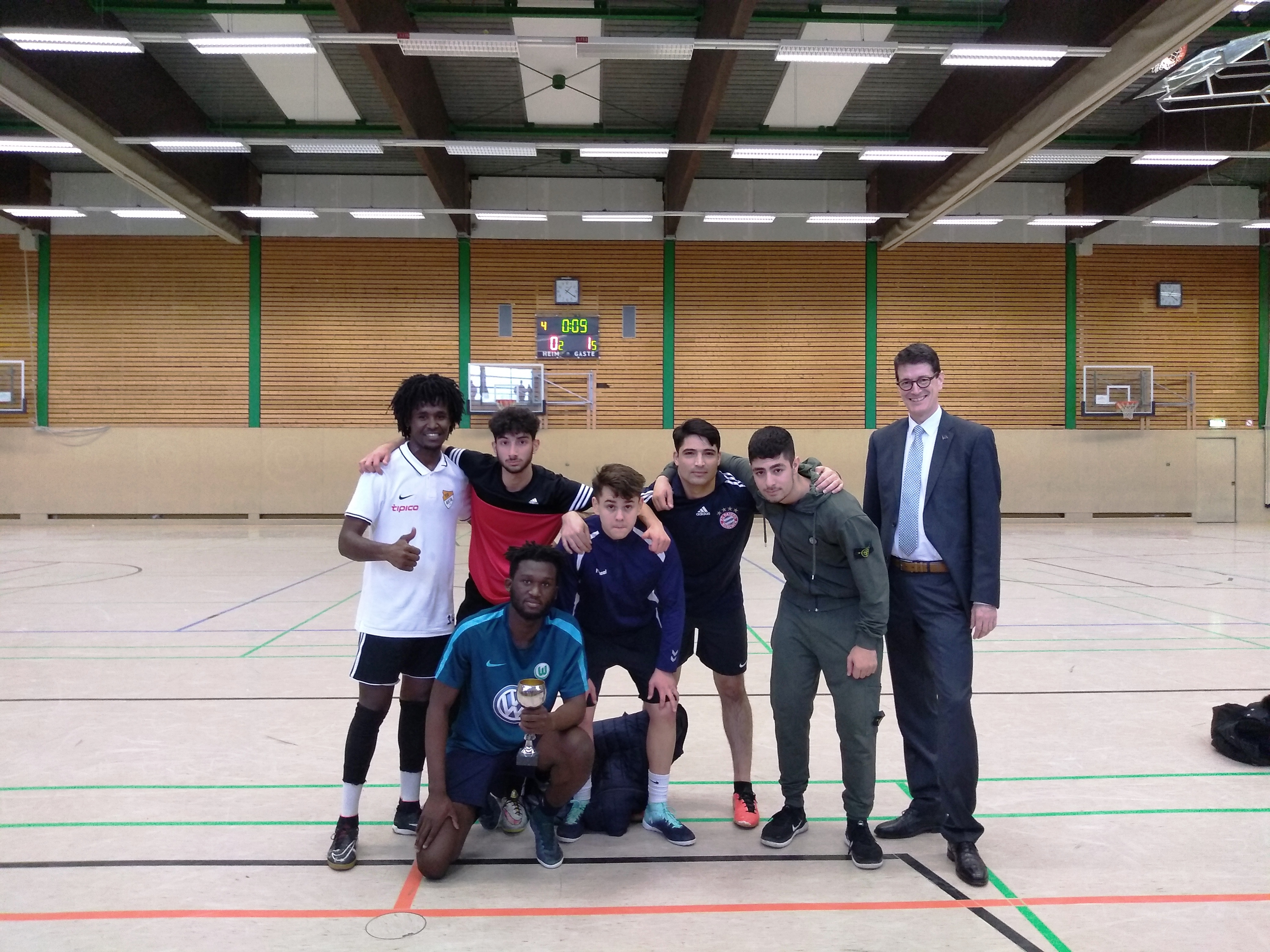 Am Ende gab es das große Aufeinandertreffen der beiden Tagessieger. Bei einer Spielzeit von 10 Minuten sollten beide Mannschaften ihr können noch einmal unter Beweis stellen. Zu diesem Zeitpunkt war die Tribüne der Halle noch bis unter das Dach gefüllt. Die heißgespielten Außenhandelskaufleute mit deutlicher konditioneller Vorbelastung oder die ausgeruhte Sprachlernklasse, hoch motiviert? Beide Teams zeigten viel individuelle Klasse. Allerdings gelang den Außenhändlern das souveränere Zusammenspiel und so konnten sich sich im Verlauf deutlich mit einem 5:0 durchsetzen. Was so eindeutig klingt, war aber dennoch richtig schön anzusehen.