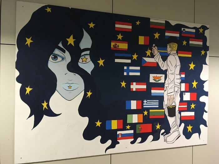 Aus verschiedenen Entwürfen wählten die Auszubildenden den von Przemyslaw Kajok zur Umsetzung im Großformat aus. Mittels Rastervergrößerung wurde die DinA3-Skizze auf die zunächst weiß grundierte MDF-Platte übertragen und anschließend sorgfältig coloriert. Das Farbkonzept zeigt die klassischen Farben der Europa-Flagge sowie die bunte Farbigkeit aller europäischen Länder-Flaggen und dazu die weiße Arbeitskleidung der MalerInnen und LackiererInnen. So entsteht eine Farbwirkung, die sowohl dynamische Frische als auch bunte Lebendigkeit ausstrahlt. Der abgebildete Maler und Lackierer gestaltet aktiv sein eigenes Bild von Europa und steht damit exemplarisch für viele Auszubildende auch, aber nicht nur, im Handwerk.