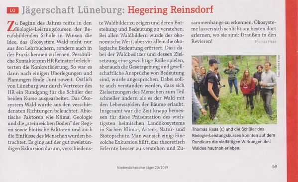 In der letzten Schulwoche des Schuljahres 2018/ 19 machten sich die Schülerinnen und Schüler der Biologie-Kurse des 12. Jahrgangs, zusammen mit ihren Lehrkräften Agnes Gregalis und Anne-Katrin Helmke, auf den Weg nach Reinsdorf. Zusammen mit dem dort ansässigen Hegering wurden die theorischten Unterrichtsinhalte, die auch Thema im Zentralabitur sind, vertieft. Die Jägerschaft Lüneburg berichtet in der Fachzeitschrift "Niedersächsischer Jäger" über die Exkursion.