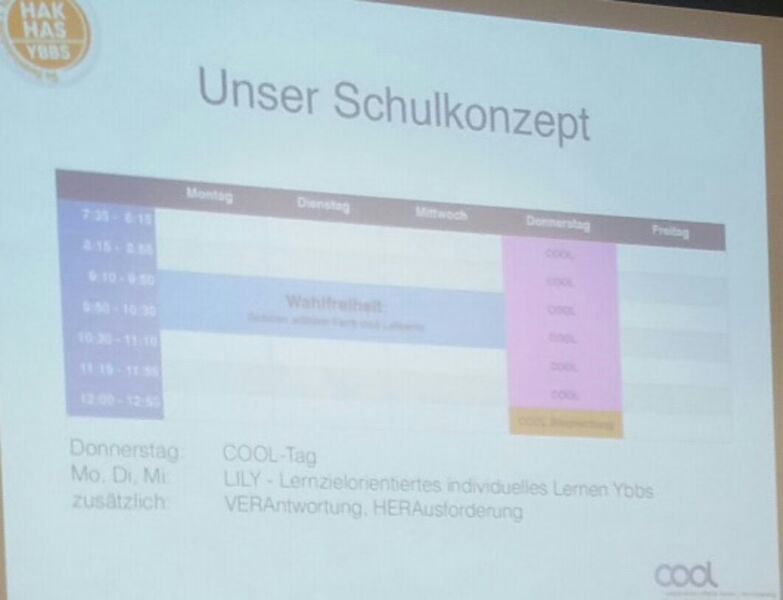An diesen Tagen wurde die Handelsakademie, Handelsschule und Höhere Technische Lehranstalt in Ybbs besucht. Hier erfolgt der Unterricht in Teilen innerhalb des COOL-Prinzips. Donnerstags ist dabei in jeder Woche "COOL-Tag". Zudem erfolgt jeweils in der 3./4. Stunde untericht nach "LILY" (Lernzielorientiertes, individuelles Lernen Ybbs"). Hier können die Schülerinnen und Schüler unter Aufsicht einer Lehrkraft in einem Klassenraum individuell an Arbeitsaufträgen arbeiten.